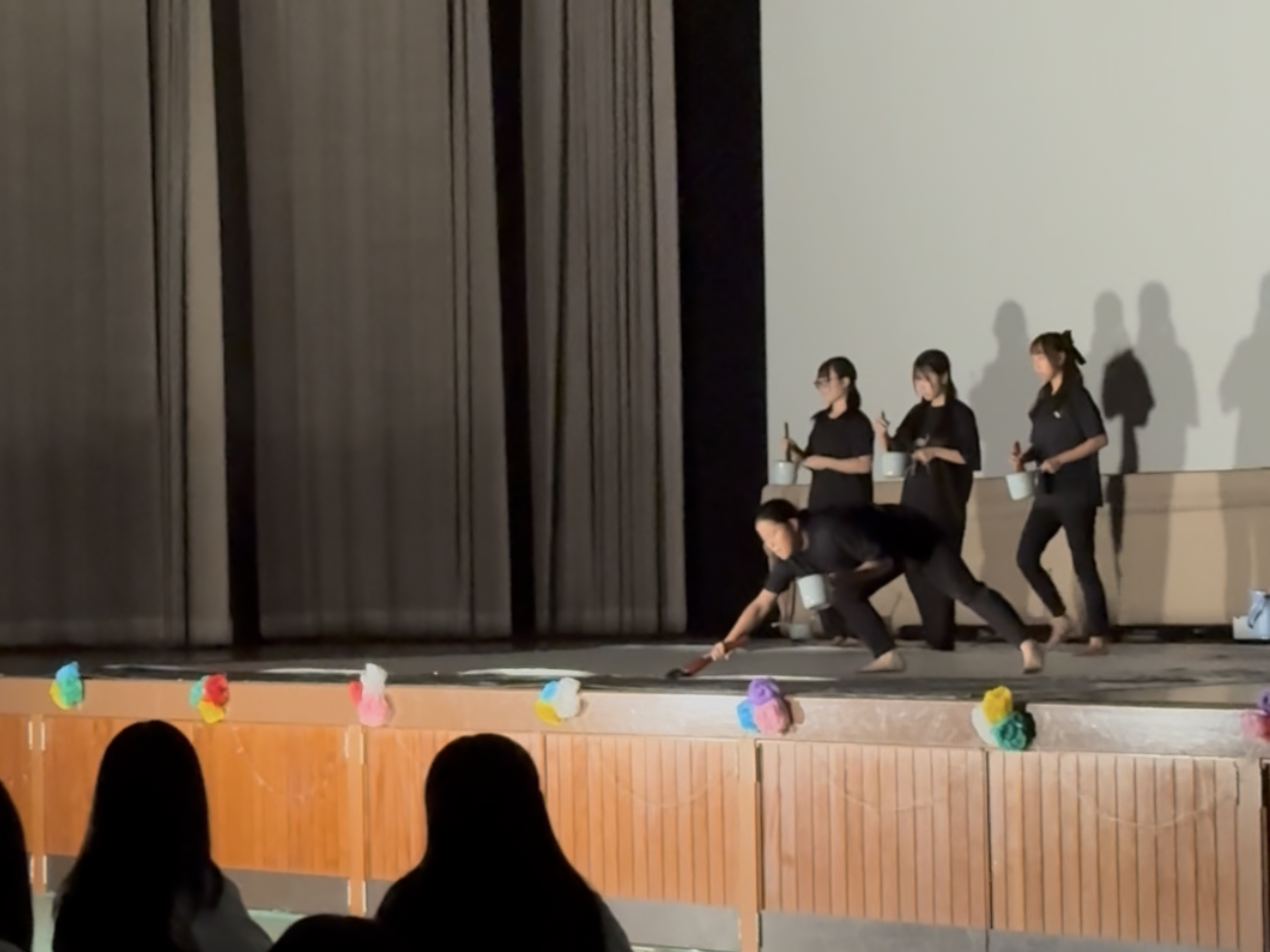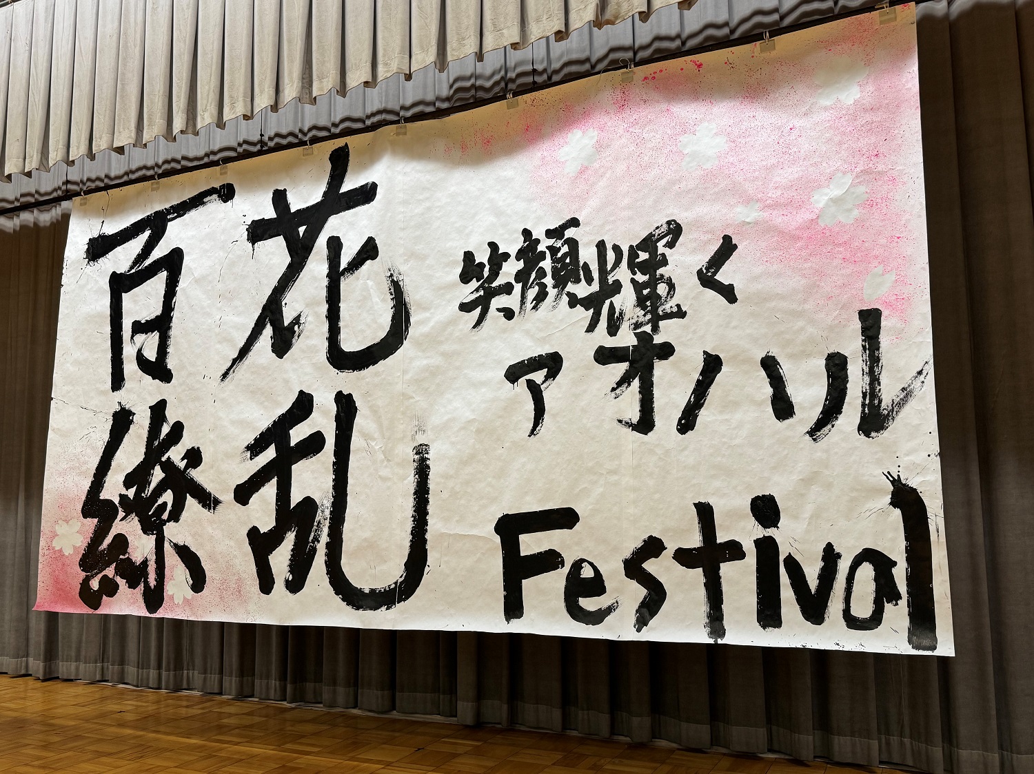 2025年9月26日(金)文化祭初日、開会式のオープニングで書道部による書道パフォーマンスを行いました。今年の文化祭のテーマ「百花繚乱~笑顔輝くアオハルFestival~」を、Perfumeの曲「FLASH」に乗せて6人で書きました。書いた作品は、静ホールのステージ上に飾りました。