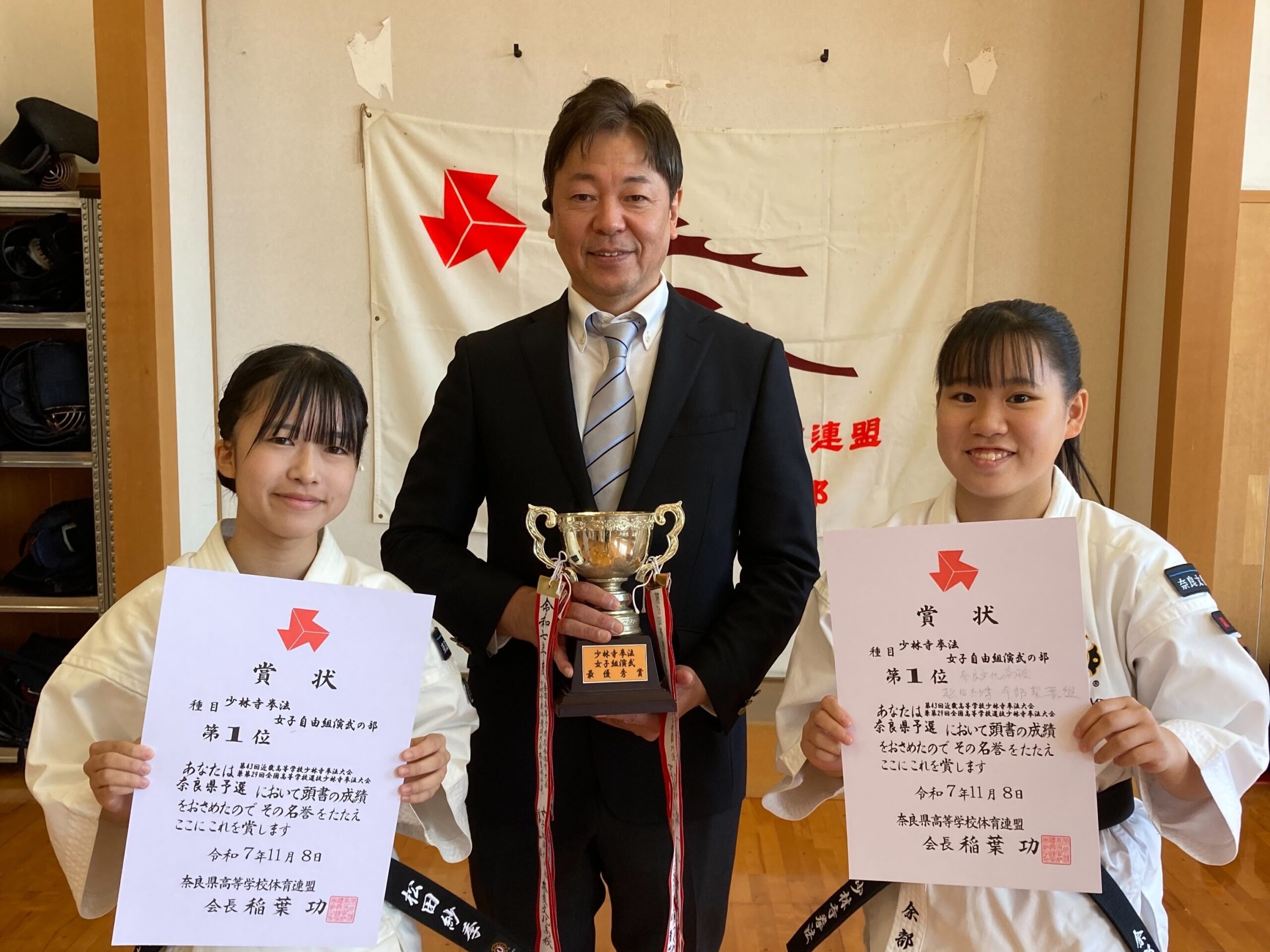 2025年11月8日(土)、「第43回近畿高等学校少林寺拳法大会兼第29回全国高等学校少林寺拳法選抜大会奈良県予選」に出場し、少林寺拳法部の余部梨葉さんと松田紗季さんの二人が見事優勝!!