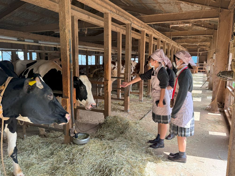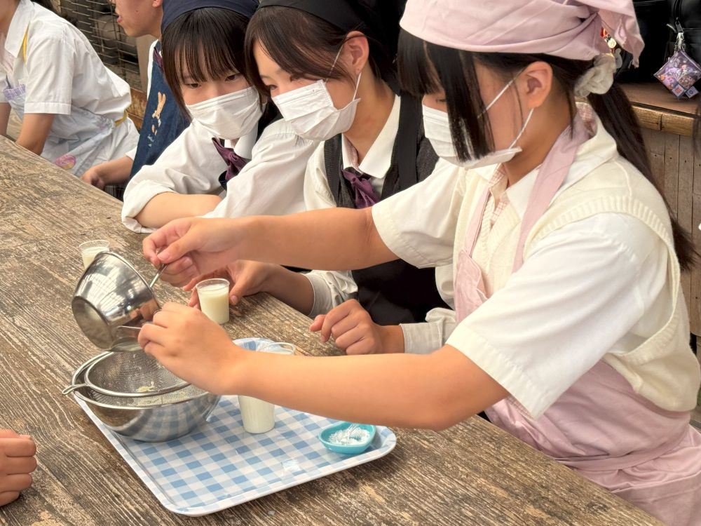 2025年10月2日、気持ちのいい秋晴れの中、2年生の普通科クラスの生徒が「農事組合法人ラッテたかまつ」へ牧場体験のフィールドワークへ行きました。アイスクリームとバターの手作り体験をしたり、牧場の牛を見学させていただいたりしました。