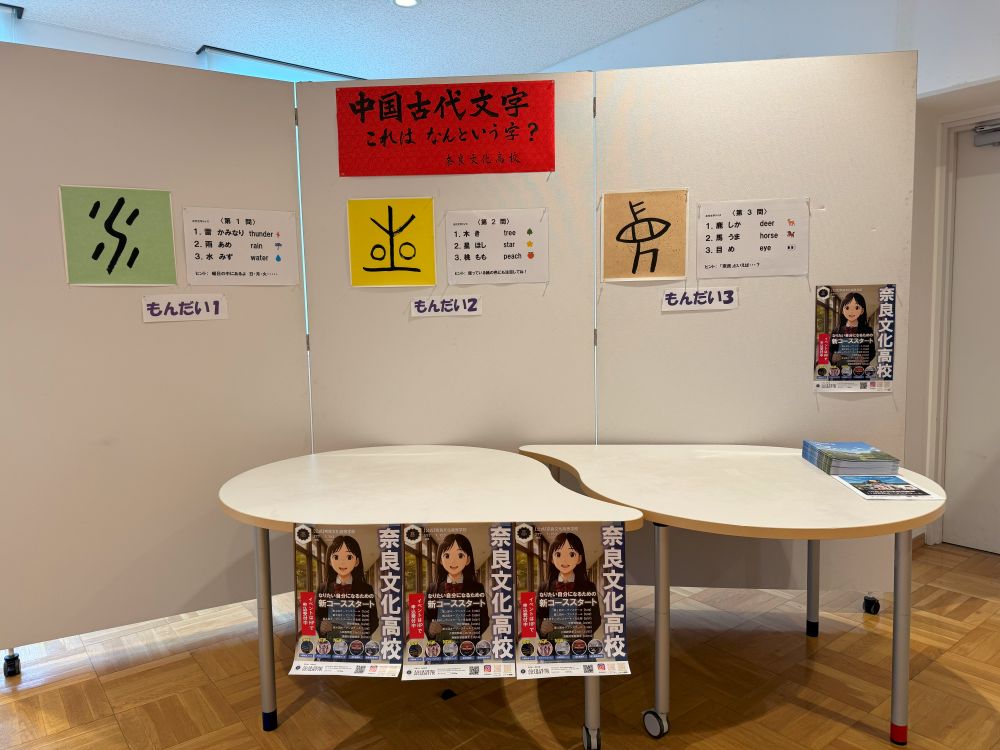 奈良文化高校からも、何か外国の文化を学ぶものを展示しようということで、書道の授業で学んでいた篆書体を使って、「中国古代文字 これは何という字?」というクイズを考えて、パネル展示しました。