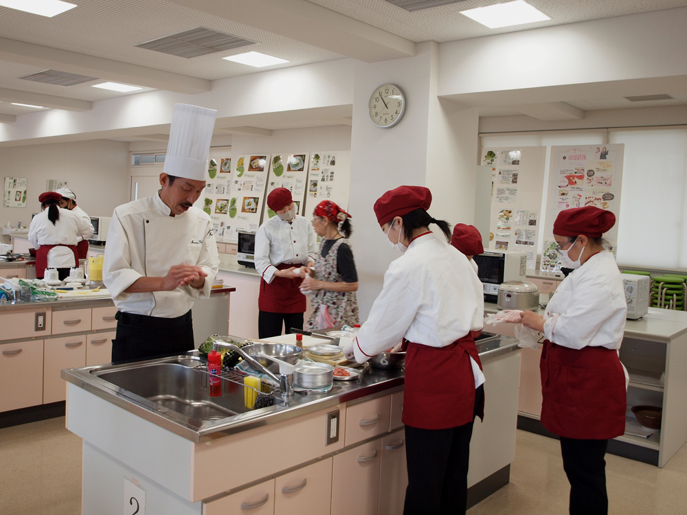 調理はグループごとに一品ずつ担当し、最後に丸田シェフのアドバイスのもと、彩りよく盛り付けました。先生方の分も含め15人分の調理は大変でしたが、生徒たちはチームワークを発揮し、時間内にすべて仕上げました。