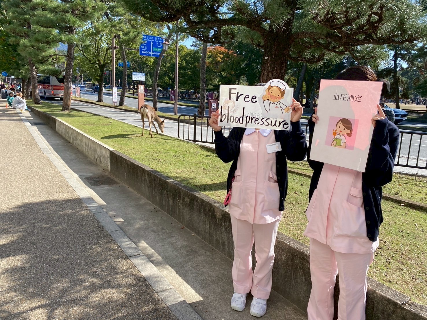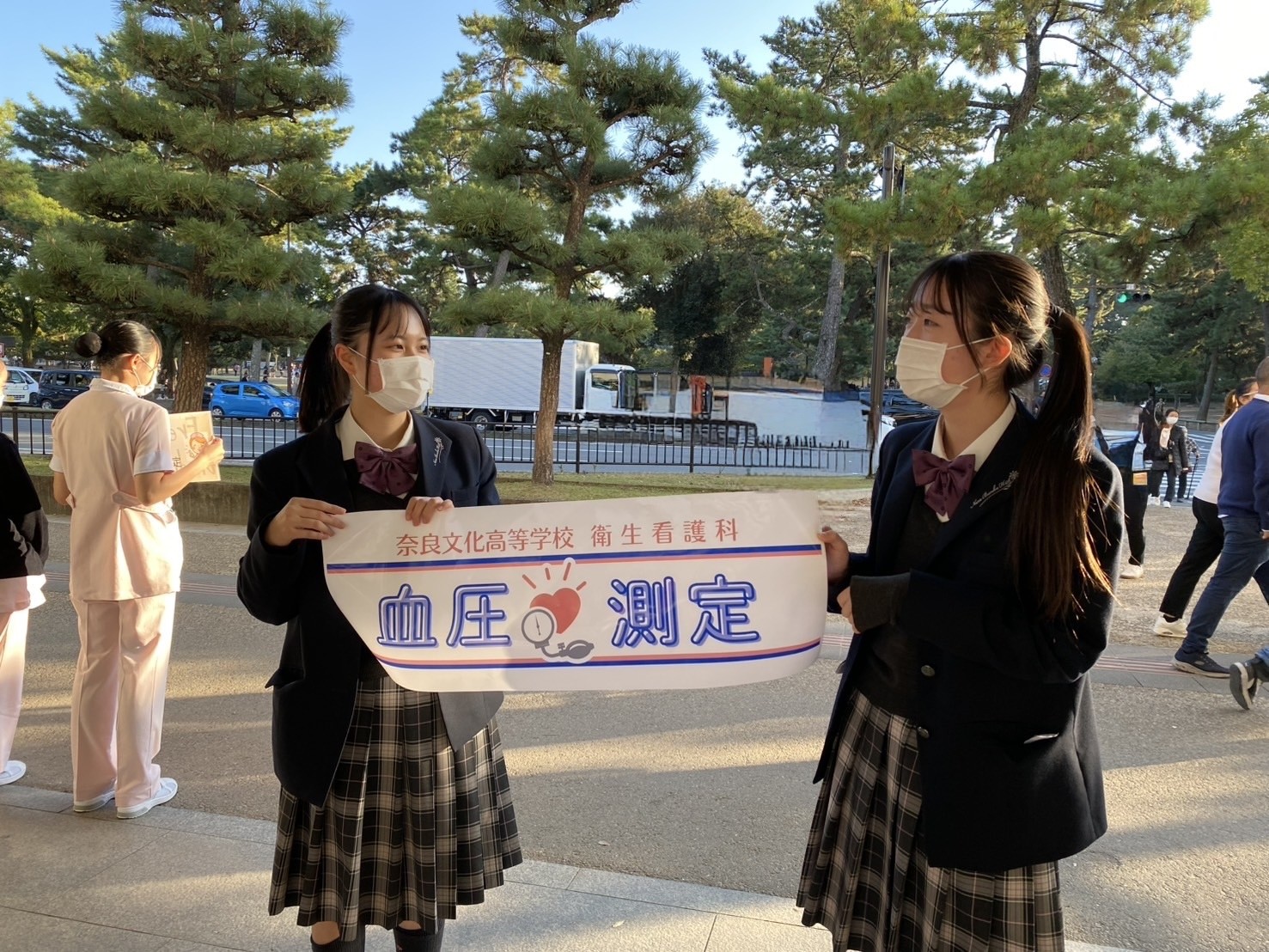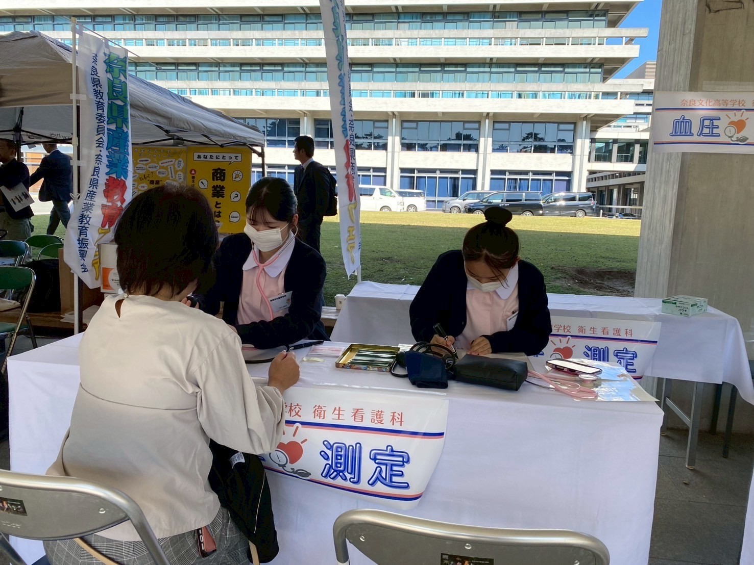 奈良県庁の回廊では、来場者の方の血圧・体脂肪測定を、奈良公園バスターミナルのレクチャーホールでは、生徒が体験発表を行いました。