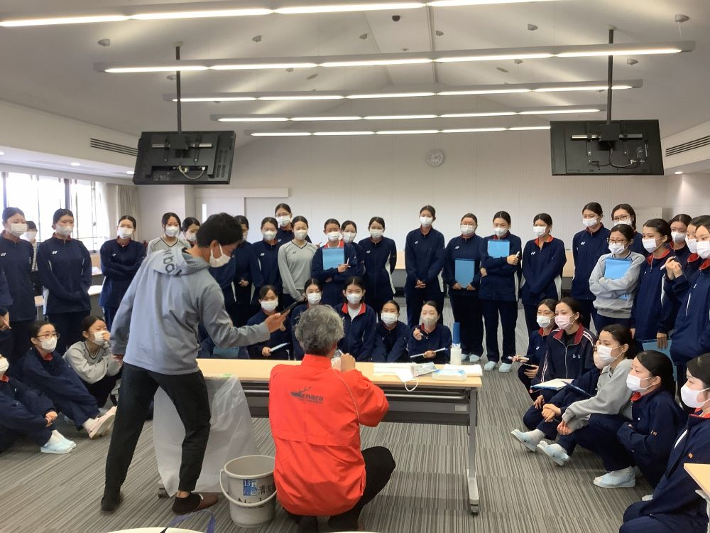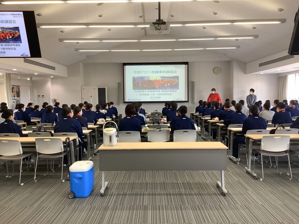 奈良文化高校の衛生看護専攻科の1年生が、今年も奈良マラソンで救護班を務めます。それに向けて、奈良教育大学の笠次良爾先生から講習を受けました。