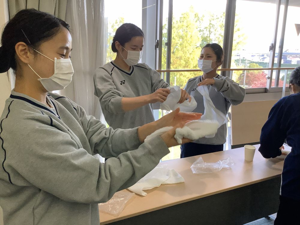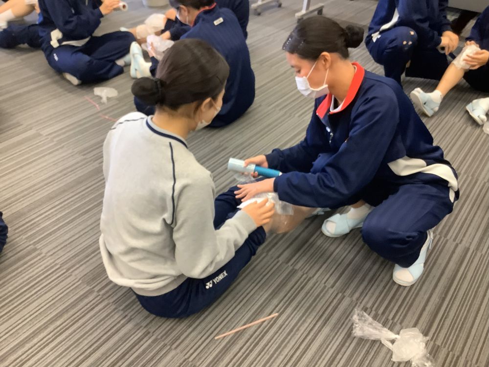 マラソンによって起こる生体への影響や、マラソンによって起こる傷病への対応技術など、アイシング・ホットパック・担送法・来室者記録など、本番に向けて演習しました。