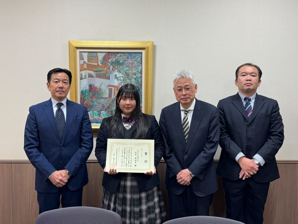 2025年12月3日(水)、1年生の水田里咲良さんが「令和7年度税に関する高校生の作文」で優秀と認められ、本校の応接室で表彰を受けました。水田さんの作文の題は「自分にとっての気づき」。この作文を書くにあたり、あらためて身の周りのことや自分の生活のことなどを振り返り、社会について考えることができたようです。