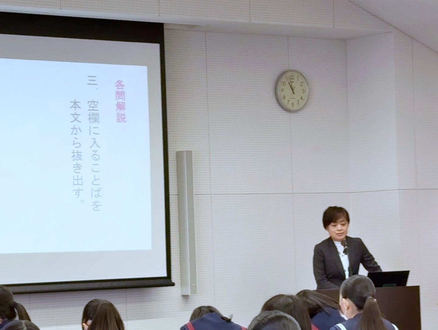 全体会では、中野善久校長からの挨拶につづいて、国語・数学・英語の各教科担当の先生からの解説です。返却された自分の解答用紙を手にしながら、問題の解き方の解説やアドバイスをしっかりとメモをしている姿が見られました。