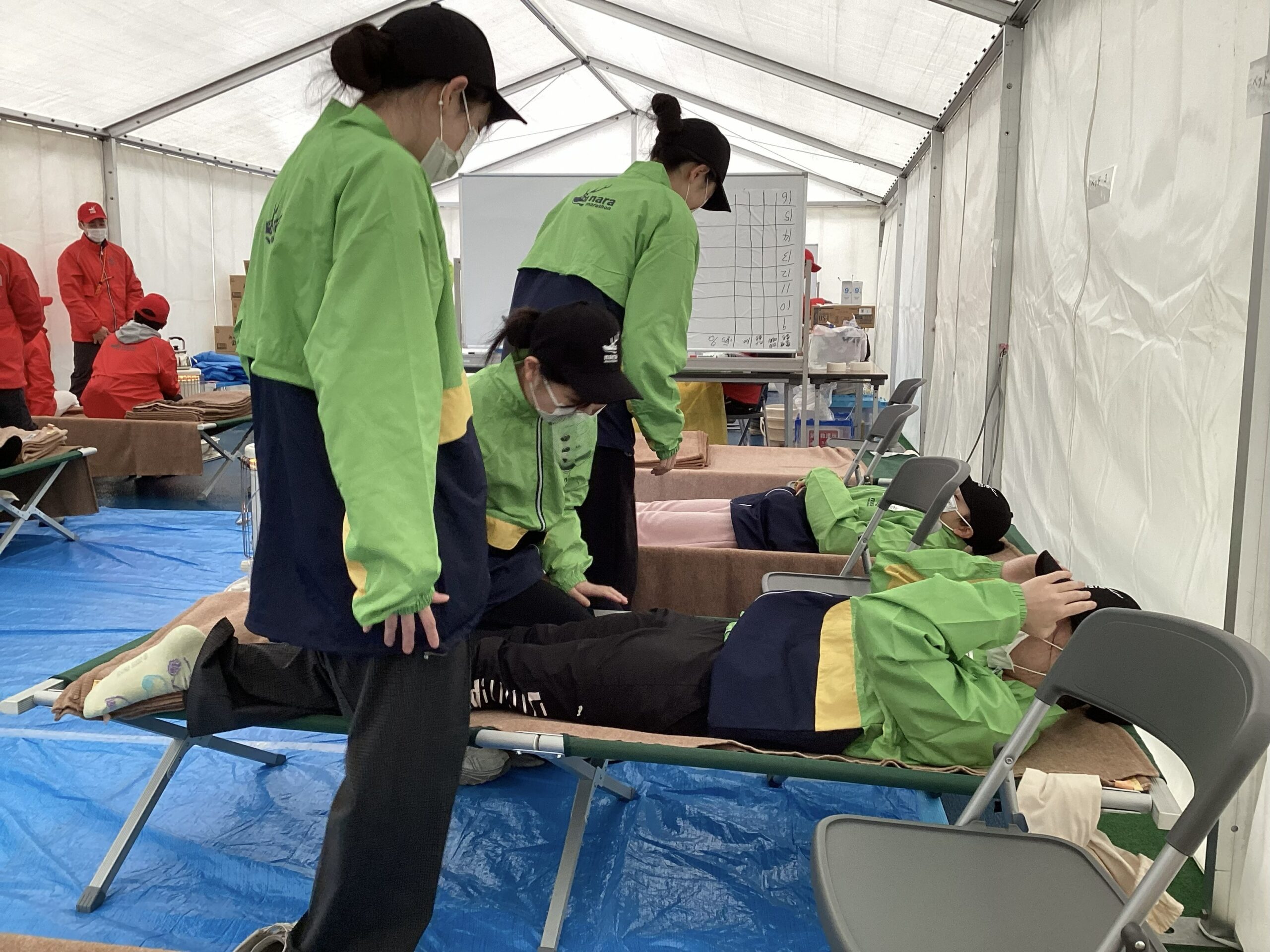 当日は朝は雨、気温も低くなっていました。学生たちは、ランナーの方が来られたらすぐに対応できるよう、待機中も救護活動のシミュレーションをしたり技術確認をしたりしていました。大会終了後にはほっとしたいつもの表情が見られました。