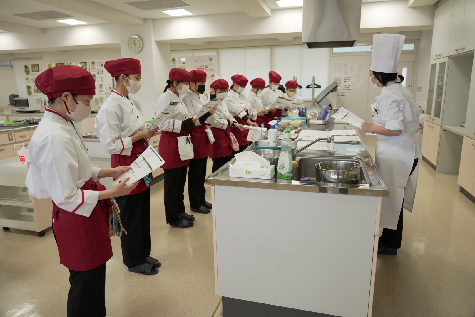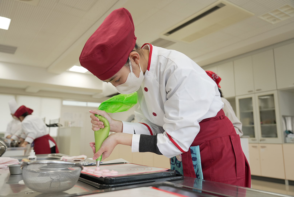 2026年1月22日(木)、食文化コースの2年生がオリジナルマカロン作りに挑戦しました。この実習は、昨年10月9日に実施した1回目のマカロン授業の続編です。前回学んだ基本の作り方をもとに、今回は生徒一人ひとりがオリジナルのマカロンを作ります。講師には、前回に引き続き辻調理師専門学校の瀬戸山先生と谷岡先生をお迎えしました。