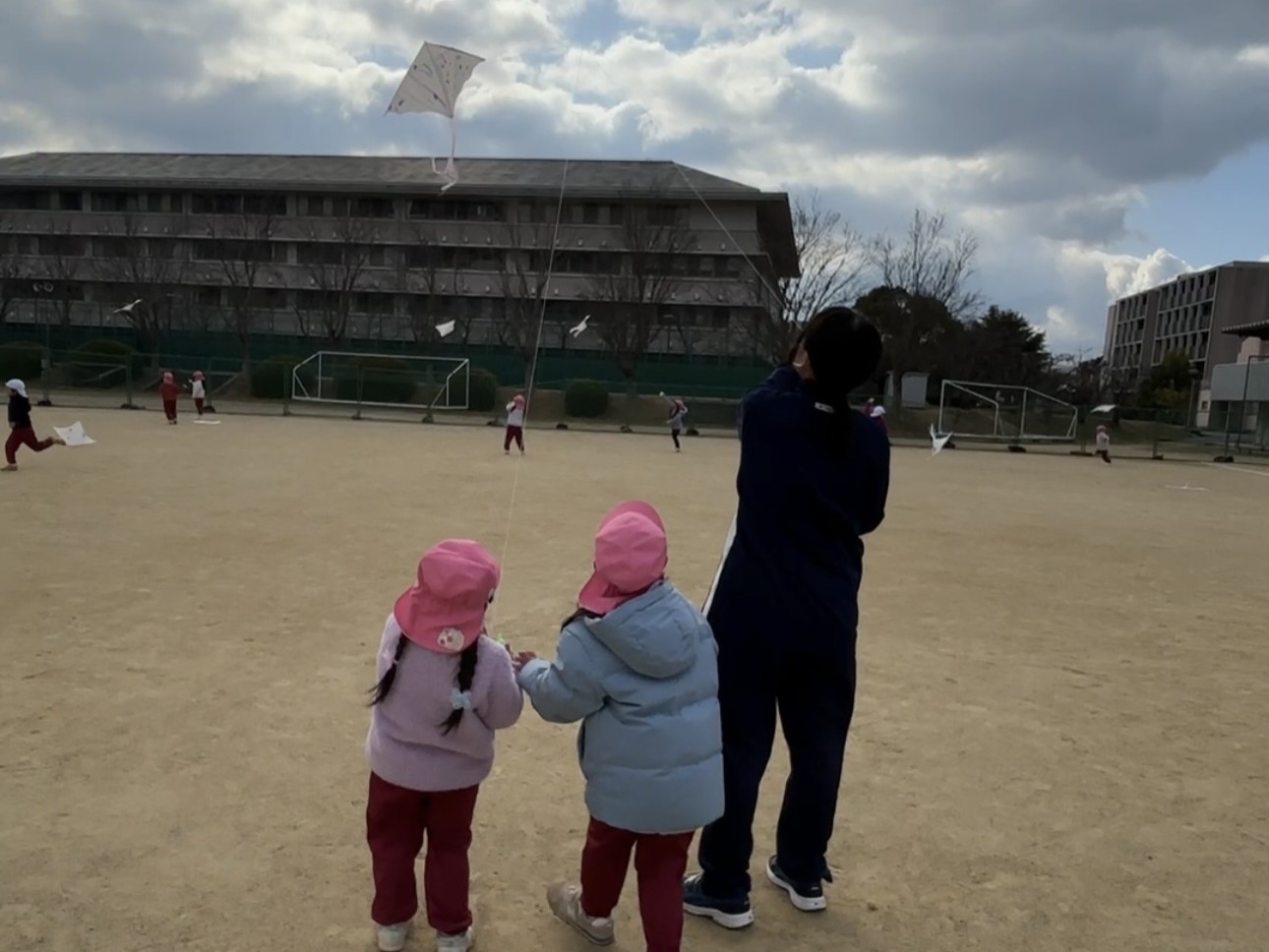 凧を揚げながら、上手に揚がると「みてみてー」とお姉ちゃん先生を呼ぶ園児さん。うまく飛んだので、報告したいようでした。そして、「もってー」と凧を飛ばすためにお姉ちゃん先生にお願いする姿もありました。