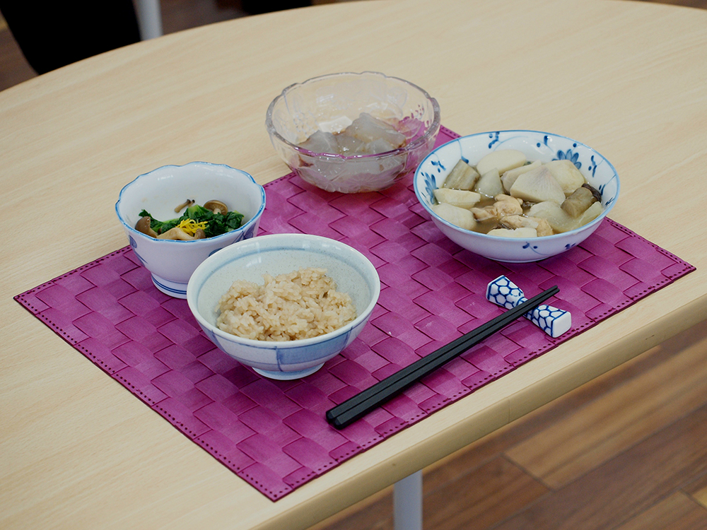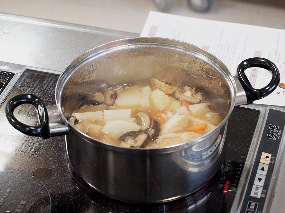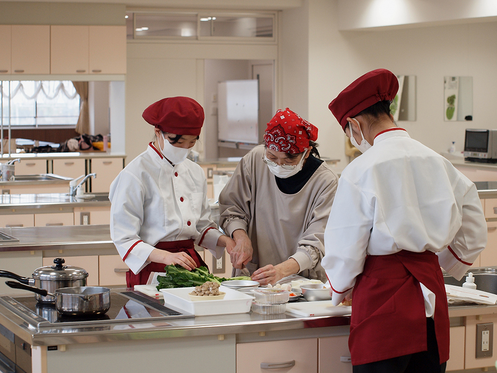 「奈良茶飯」は、お米にほうじ茶の煮出し汁、炒り大豆、少量の塩を加えて炊く料理です。東大寺などの僧坊で、古くから食べられてきたといわれています。「のっぺ」は全国各地で作られる根菜の薄味煮物です。地域によって具材や出汁に特徴があり、新潟では正月料理として鮭やイクラが入ることもあるそうです。実習では、先生に教わりながら、サトイモ、ゴボウ、ニンジン、ダイコン、厚揚げ、干ししいたけなどを出汁でじっくり煮込みました。