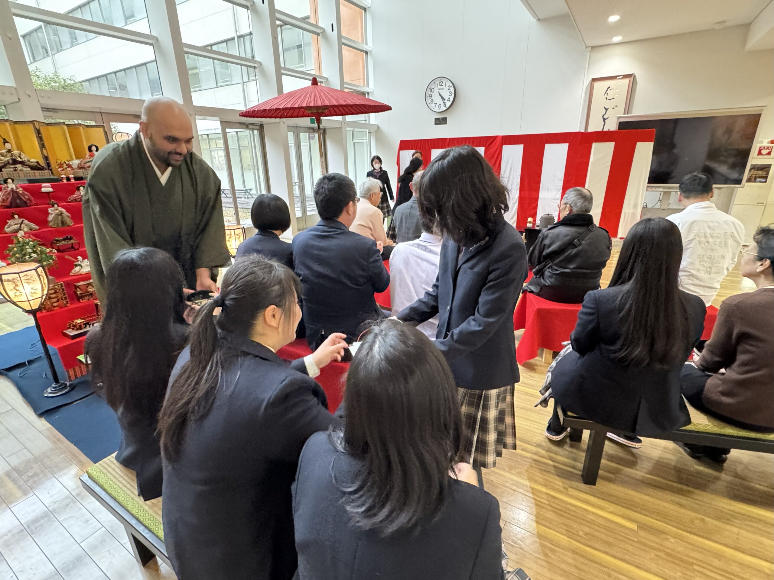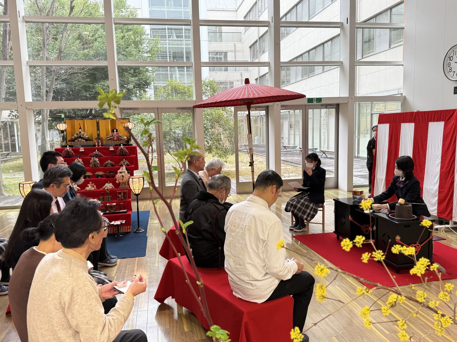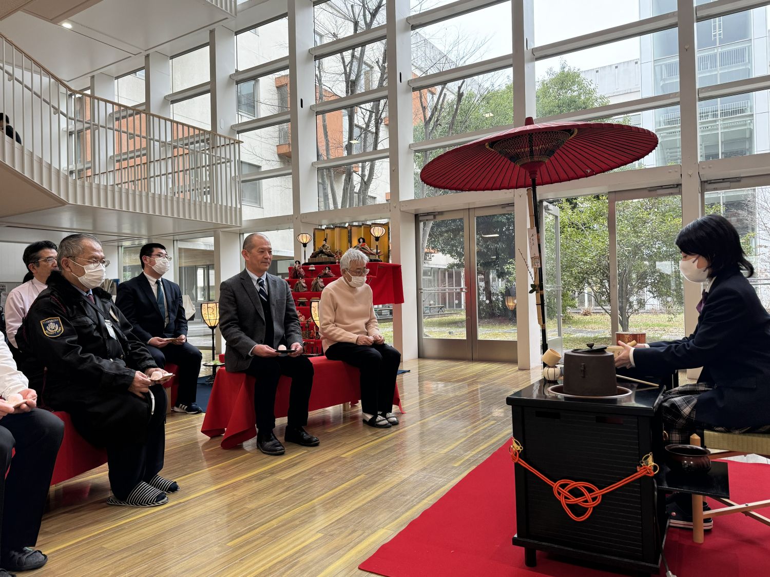 みやび棟1階のきららプラザに飾られた「ひな飾り」の前で、茶道部がお雛まつり茶会を開きました。